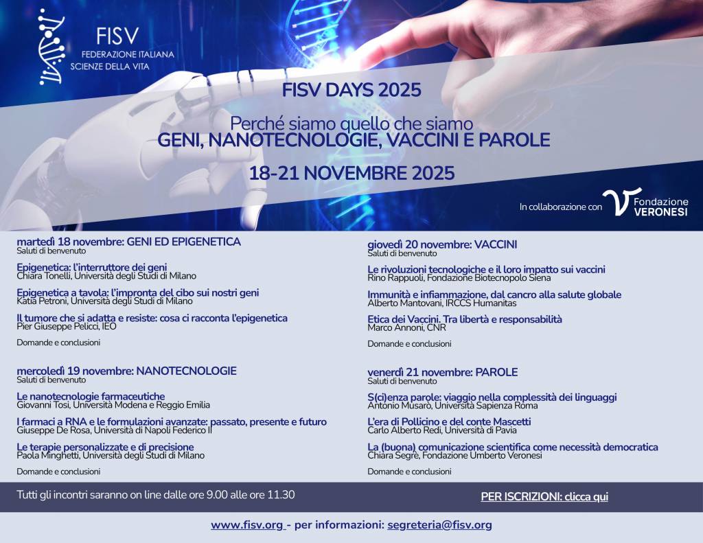 Tornano dal 18 al 21 novembre i FISV Days, le giornate di divulgazione scientifica dedicate a studenti e docenti delle Scuole Secondarie Superiori.